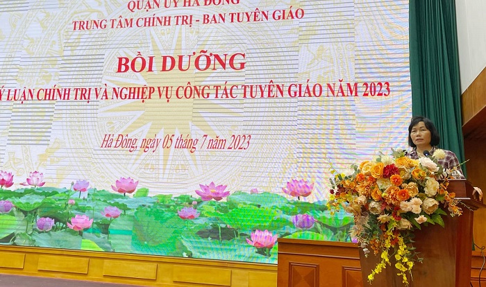 Tiếp đó, đồng chí Nguyễn Thị Tâm, Ủy viên Thường vụ, Trưởng ban Tuyên giáo Quận ủy, Giám đốc Trung tâm Chính trị Quận đã thông tin tại hội nghị về tình hình phát triển kinh tế - xã hội của quận Hà Đông trong 6 tháng đầu năm 2023; một số kết quả trong việc thực hiện công tác tuyên giáo 6 tháng đầu năm 2023 trên các lĩnh vực: về tổ chức Cuộc thi chính luận bảo vệ nền tảng tư tưởng của Đảng, lần thứ III; về việc thực hiện Kết luận 01-KL/TW và thực hiện chuyên đề học tập và làm theo tư tưởng, đạo đức, phong cách Hồ Chí Minh năm 2023; về công tác dư luận, báo chí phản ánh các vấn đề bức xúc liên quan tới Hà Đông... Để tiếp tục thực hiện có hiệu quả công tác tuyên giáo, đồng chí cũng yêu cầu các đại biểu tập trung thực hiện tuyên truyền, nắm bắt dư luận xã hội 10 nhiệm vụ, trọng tâm của quận trong 6 tháng cuối năm 2023.